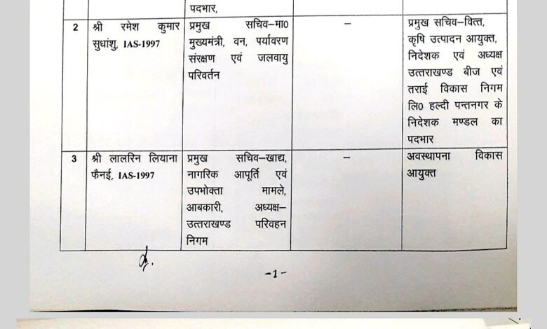 प्रमुख सचिव आरके सुधांशु को वर्तमान विभागों के साथ वित्त, कृषि उत्पादन आयुक्त, निदेशक एवं अध्यक्ष उत्तराखंड बीज एवं तराई विकास निगम का प्रभार दिया गया है। प्रमुख सचिव एल फैनई को वर्तमान दायित्व के साथ अवस्थापना विकास आयुक्त की जिम्मेदारी दी गई है। सचिव मुख्यमंत्री शैलेश बगौली गृह के साथ अब कार्मिक एवं सतर्कता विभाग की जिम्मेदारी भी देखेंगे।