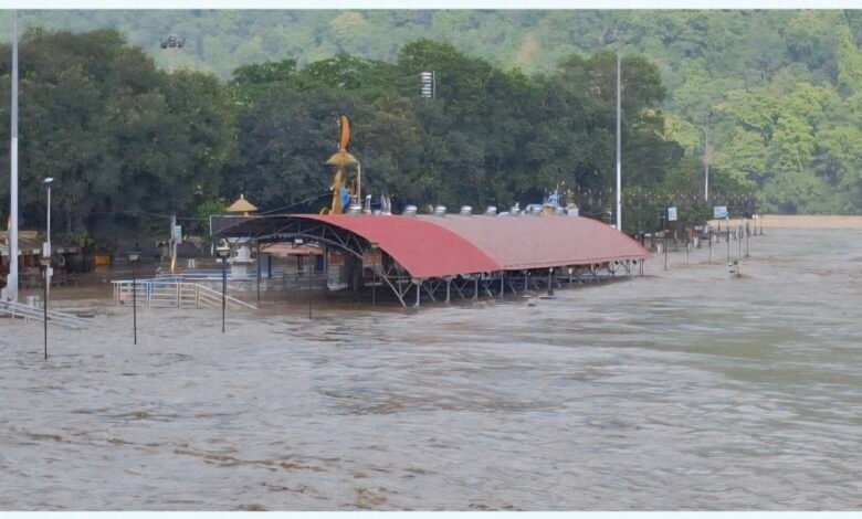 ऋषिकेश में खतरे के निशान से ऊपर बह रही गंगा, सहायक नदिया भी उफान पर, त्रिवेणी घाट का आरती स्थल और पार्किंग सही अन्य कई घाट आए गंगा के चपेट में, गली मोहल्लों में भी घुसा पानी, प्रशासन द्वारा लगातार लोगों को किया जा रहा अलर्ट।