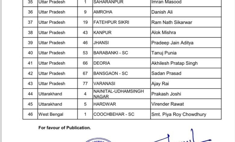 कांग्रेस ने नैनीताल लोकसभा से प्रकाश जोशी और हरिद्वार लोकसभा से पूर्व मुख्यमंत्री हरीश रावत के पुत्र वीरेंद्र रावत को किया गया प्रत्याशी घोषित। हरीश रावत ने अपने पुत्र वीरेंद्र रावत को हरिद्वार लोकसभा से चुनाव लड़ाने की पैरवी की थी।
