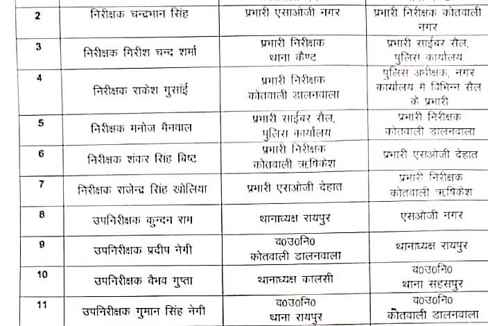 सोमवार देर रात को देहरादून के वरिष्ठ पुलिस अधीक्षक ने 7 निरीक्षक व 7 उप निरीक्षकों के तबादले किए है। जिसमें निरीक्षक कैलाश चंद्र भट्ट को प्रभारी निरीक्षक कोतवाली नगर से प्रभारी निरीक्षक थाना कैंट, निरीक्षक चंद्रभान सिंह को एसओजी नगर से प्रभारी निरीक्षक कोतवाली नगर बनाया है। निरीक्षक गिरीश चंद्र शर्मा को प्रभारी निरीक्षक धारा कैंट से प्रभारी साइबर सेल पुलिस कार्यालय किया गया। निरीक्षक राकेश गुसांई को प्रभारी निरीक्षक डालनवाला कोतवाली से नगर अधीक्षक कार्यालय विभिन्न सेल का प्रभारी बनाया गया है। निरीक्षक शंकर सिंह बिष्ट को प्रभारी निरीक्षक कोतवाली ऋषिकेश से प्रभारी एसओजी देहात तो निरीक्षक राजेंद्र सिंह को प्रभारी एसओजी देहात से प्रभारी निरीक्षक कोतवाली ऋषिकेश बनाया गया है।